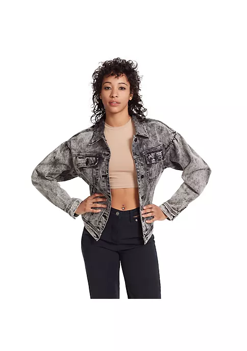 Classic oversized drop shoulder black acid wash trucker jacket. 99% cotton, 1% spandex.