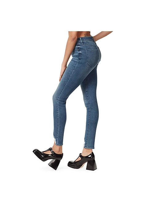 High Rise Skinny, 59% cotton, 28% poleyester, 12% 1% spandex.