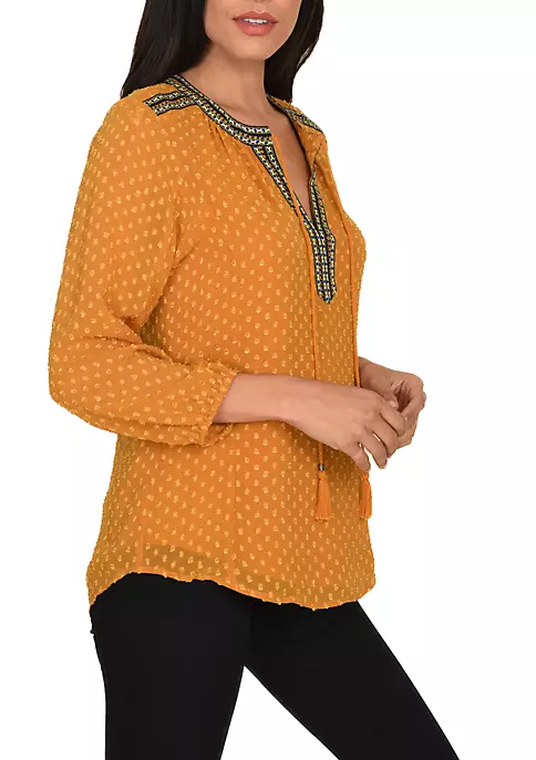 The beatifully textured Kendall blouse features perfectly gathered 3/4 sleeves and a chic v-neck with tassels. Simply pair this top with any leggings, jeans, trousers, or casual pants for a sophisticated and timeless outfit.