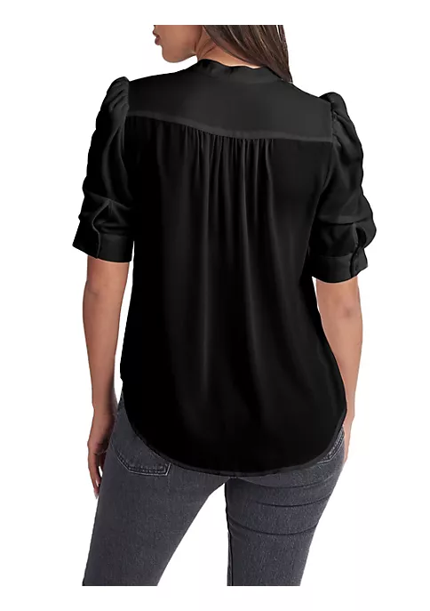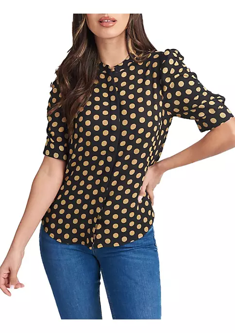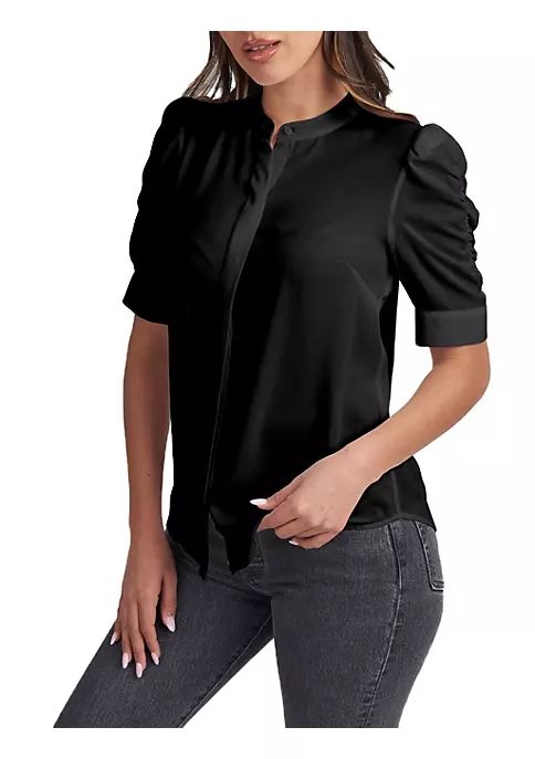 With a classic button-down front and ruffle sleeve details, this dreamy blouse adds a bit of pizazz to your closet. Create a ready-for-anything look with this crisp top and a pair of strappy pumps or a pair of sweet flats for the office.