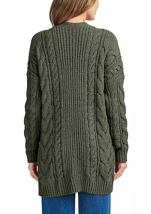 This sweater is a throw-on-and-go basic with its traditional cable knit pattern and dark olive hue. The two front pockets are ideal for holding your keys and phone while running quick errands.