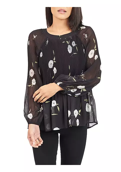 This top evokes old-world glamour with its delicately shirred front, breezy sheer sleeves, and refined floral motif. Wear this stately blouse for a night-out or a holiday party.