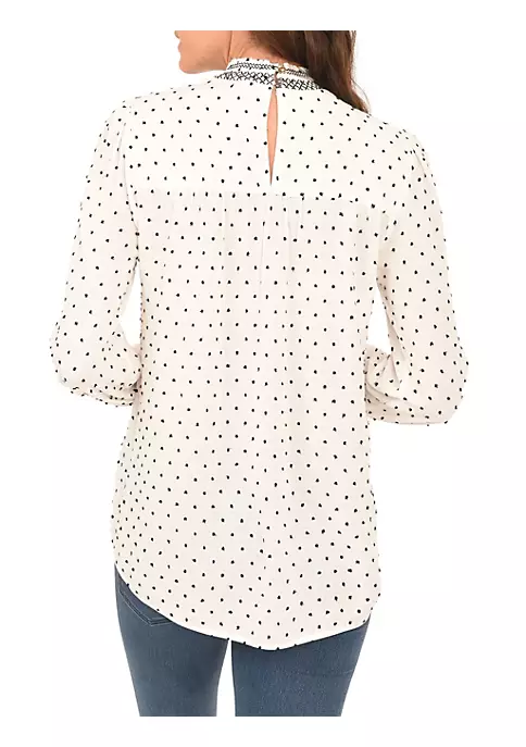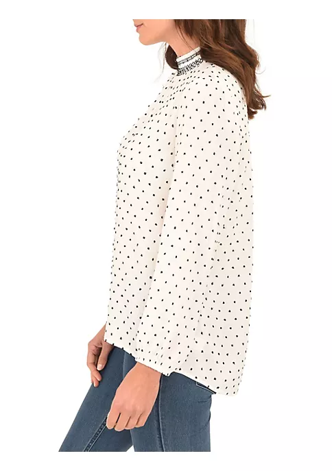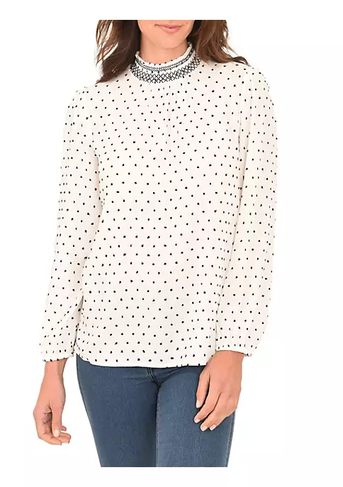 This mock turtle neck is a chic long sleeve top that is stylish yet simple at the same time. The clip dots along with the soft sheer fabric helps bring some texture to this elegant design.