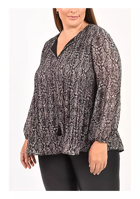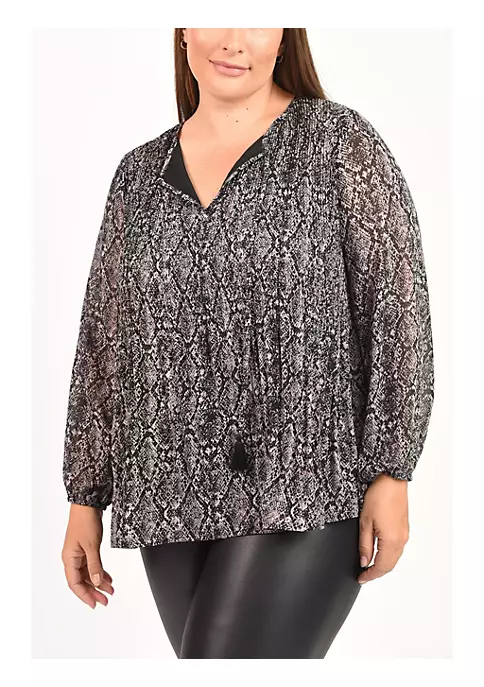 This peasant top is a versatile piece for the cooler temps with its charming long gathered sleeves, daring bold prints, and split neck with tassels. Pair this easy-to-style blouse with a pair of dark denim jeans and high heels for a night-out.