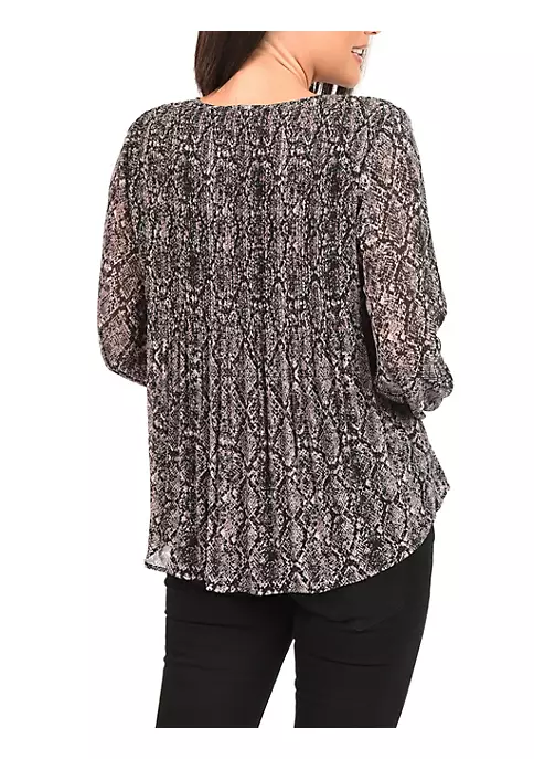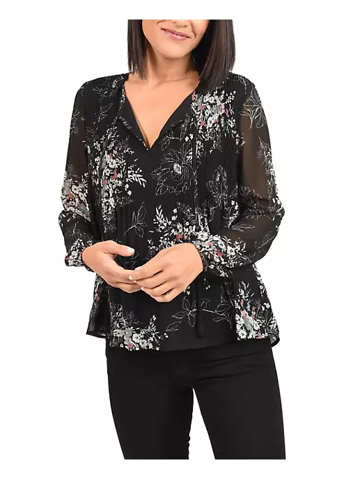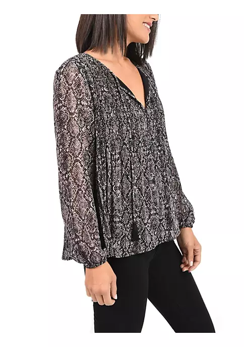 This peasant top is a versatile piece for the cooler temps with its charming long gathered sleeves, daring bold prints, and split neck with tassels. Pair this easy-to-style blouse with a pair of dark denim jeans and high heels for a night-out.
