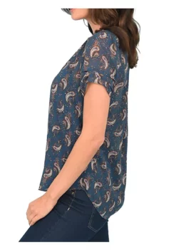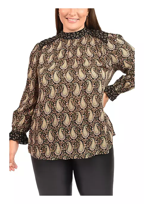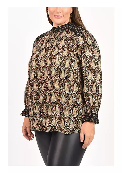 This blouse offers a trendy color-block design over the classic mock turtle-neck and shoulders for a bold statement outfit. Pair it with dark denim jeans and suede boots for a fashionable fall attire.
