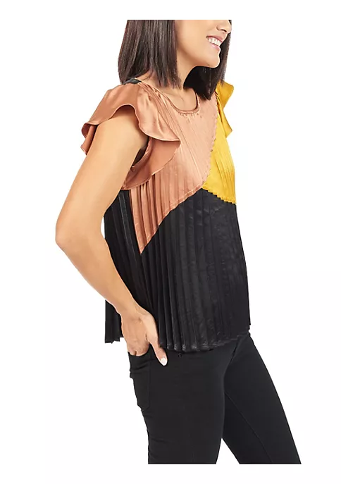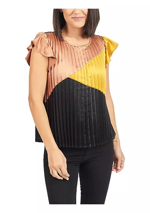 This blouse offers a modern twist to any outfit with its art deco inspired design, daring pleats, and flouncy cap sleeves. Take this top to any party, holiday, vacation or date night for an attention grabbing ensemble.