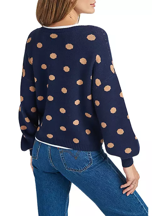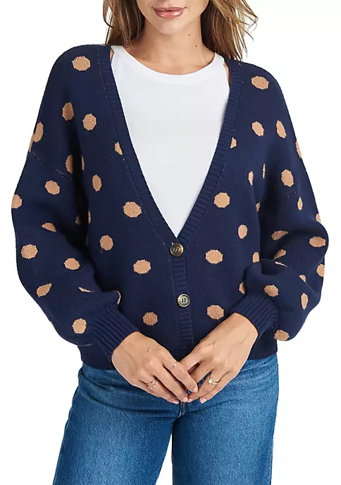 Sweeten up your closet with this V-neck cardigan. This stylish sweater features long puff sleeves and a polka-dot design that blends perfect style with enduring comfort.