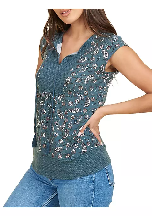 The pretty cap sleeves and feminine open neckline with tassels make this floral top a must-have favorite. Wear this boho top to a day in the park or any outdoor casual outing.