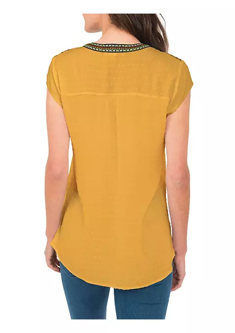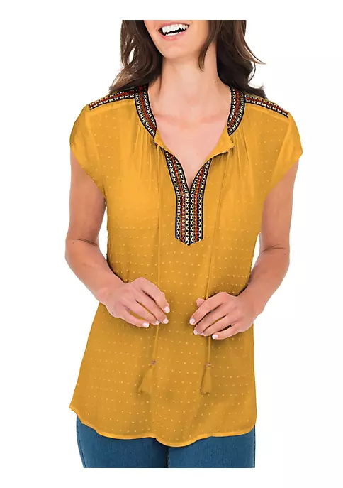 A pastel colored top for all occasions, if that’s what you are looking for, do not look any further. Simple, minimalist, and elegant, this top has capped sleeves, a very feminine silhouette, and threadwork on a bed of black in the decolletage area. Pair it with any black-colored bottom-wear for an ensemble that is appropriate and great for any semi-casual to casual outing.