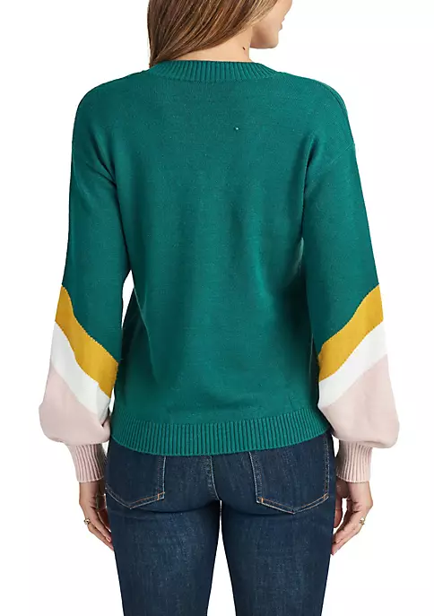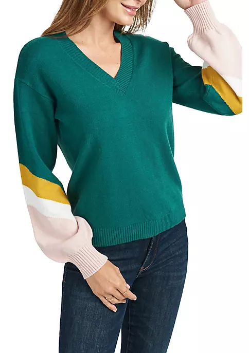 Achieve a carefree look with this sweater featuring a timeless v-neck and striped long sleeves. This charming pullover wears best with dark wash denim and boots.