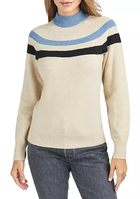 Nothing feels as comfortable on a cold autumn day as this sweater. The snug turtleneck and cool blue strips give you a cozy but polished look to your jeans and boots outfit.