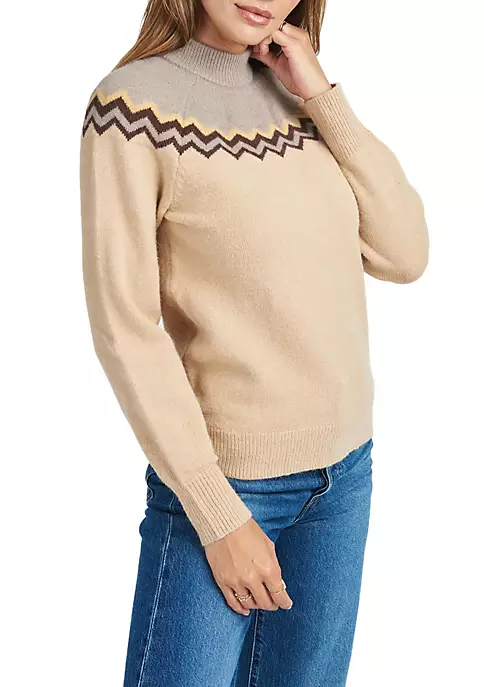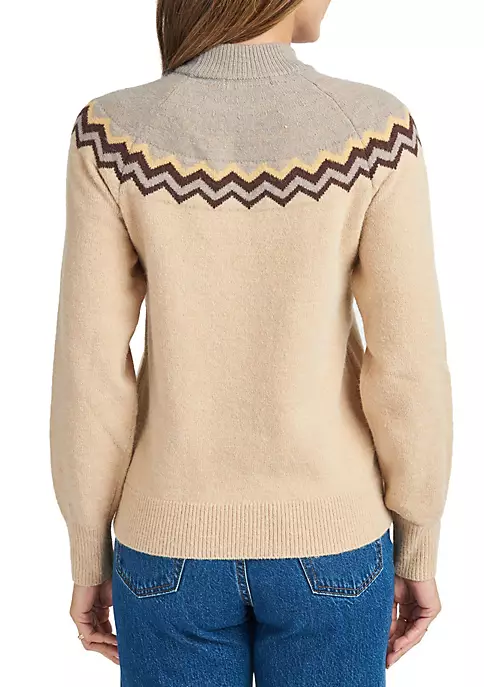 Snuggle up to the fire with this turtleneck sweater. The neutral dual tone color is accentuated with a classic chevron pattern. Wear it over your favorite dark denim and boots for a cozy camping look.