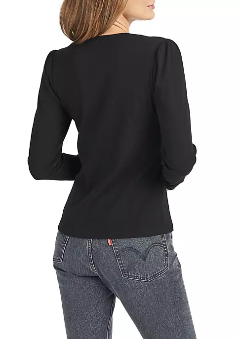 This sweater is anything but basic with its statement puff sleeves and textured rib knit. The timeless v-neck and black color offer endless style possibilities.